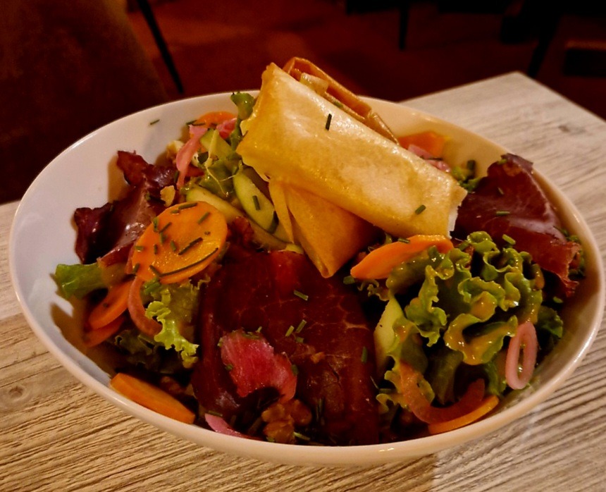 Cette salade se compose de brick croustillantes de reblochon fermier affiné, Bœuf séché artisanal de la maison Baud, pickles d’oignons rouges, de carottes et de betterave, pomme granny Smith pour la fraîcheur, noix et salade.